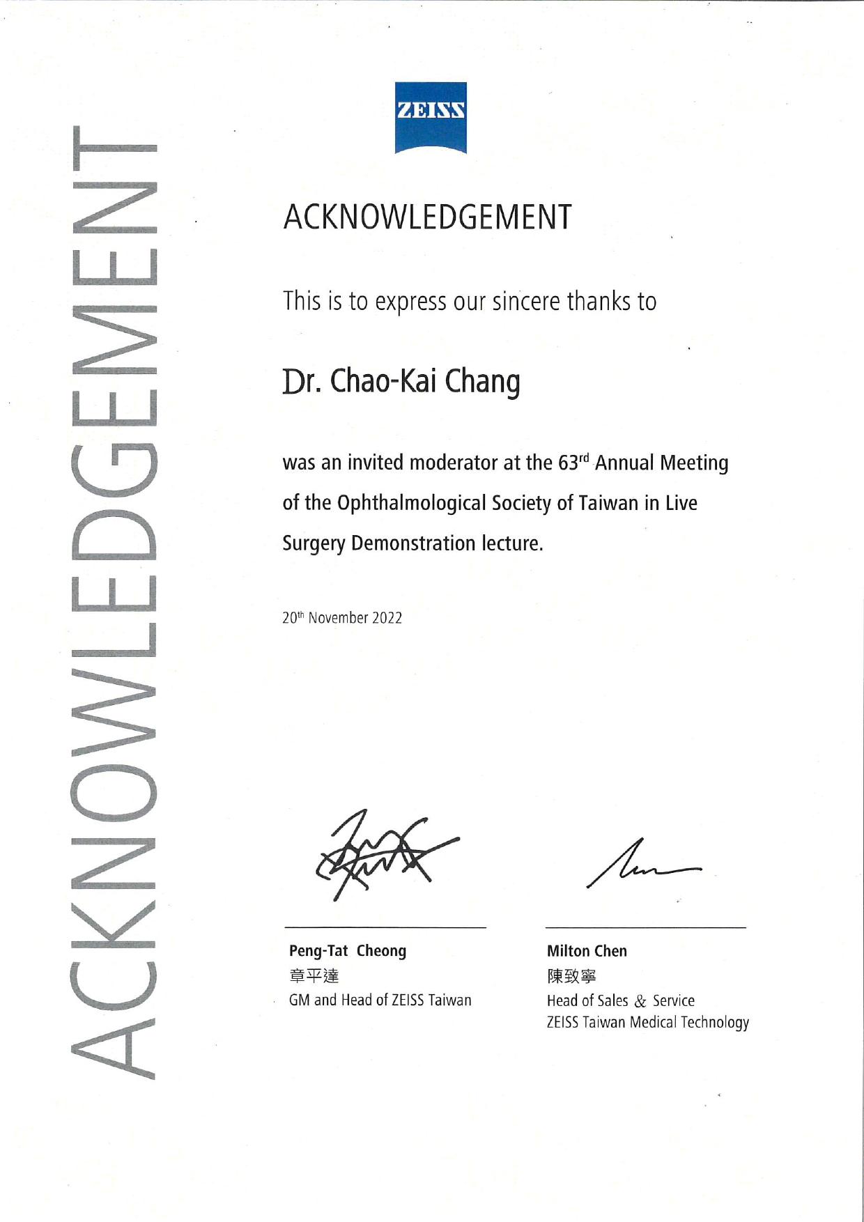 民國111年11月-【ZEISS 】擔任眼科醫學會座長
