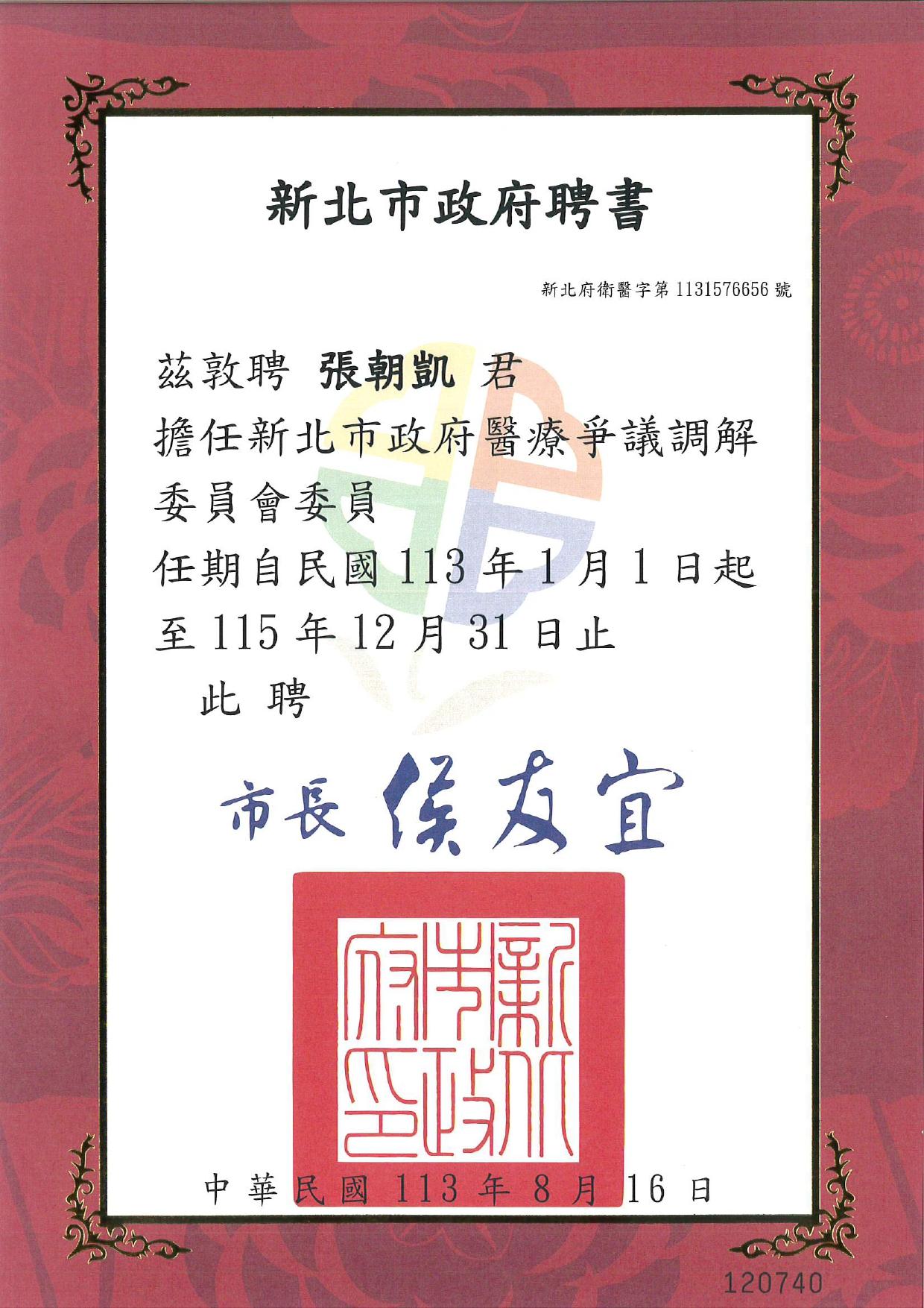 民國113年1月至115年12月-聘書-擔任新北市政府醫療爭議調解委員會委員