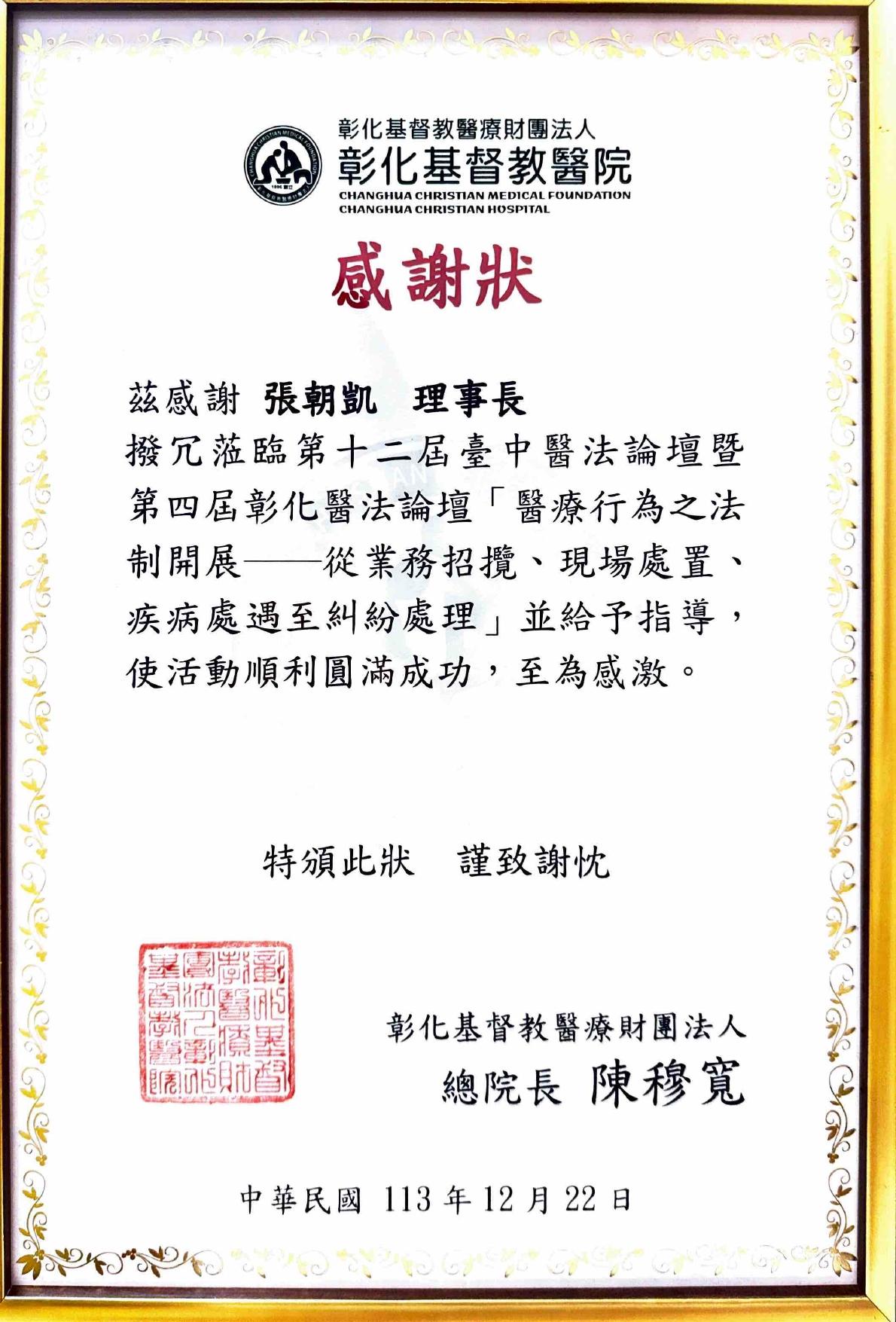民國113年12月-感謝狀-第12屆台中醫法論壇暨第四屆彰化醫法論壇感謝狀