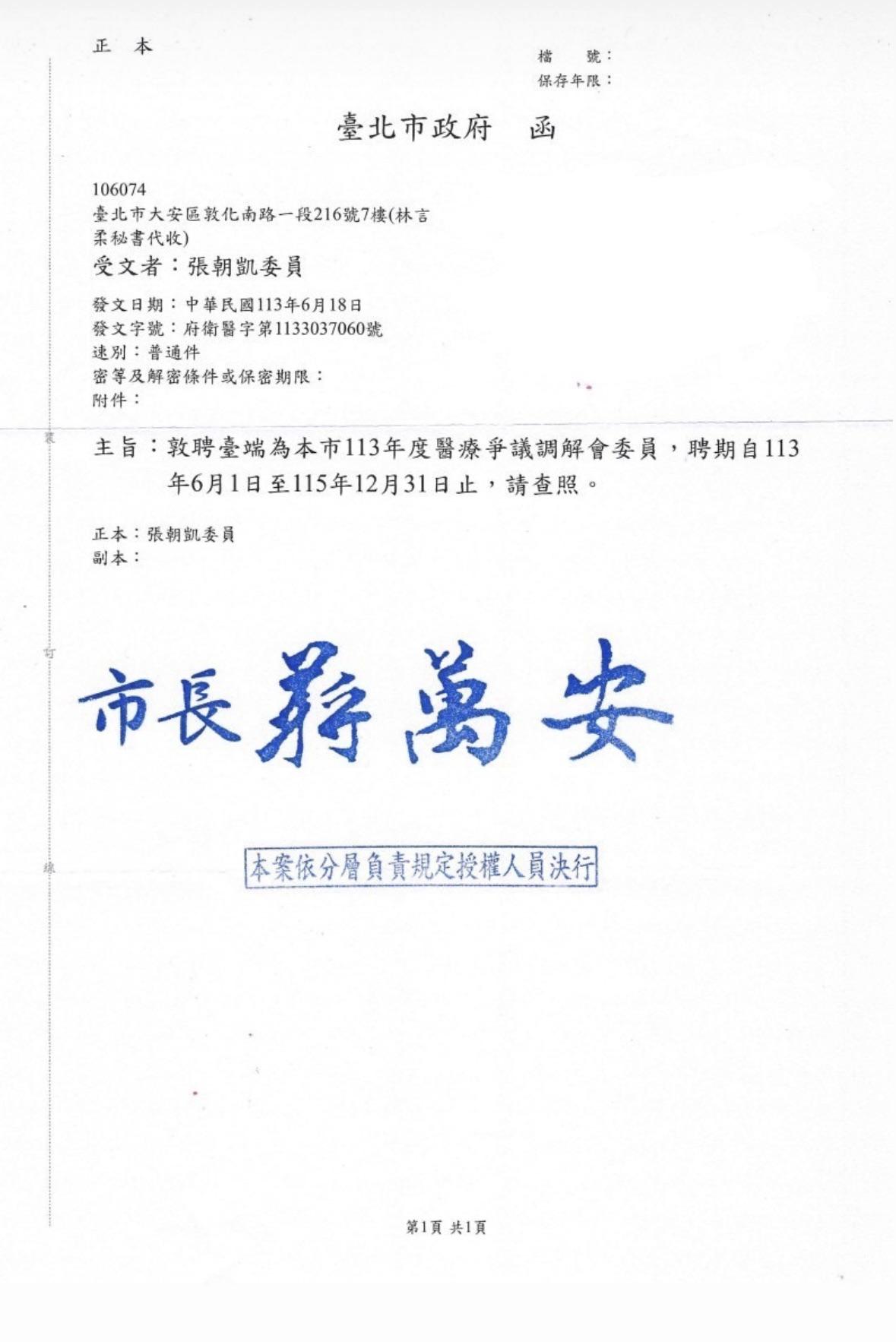 民國113年6月至115年12月-聘書-擔任台北市政府醫療爭議調解會委員