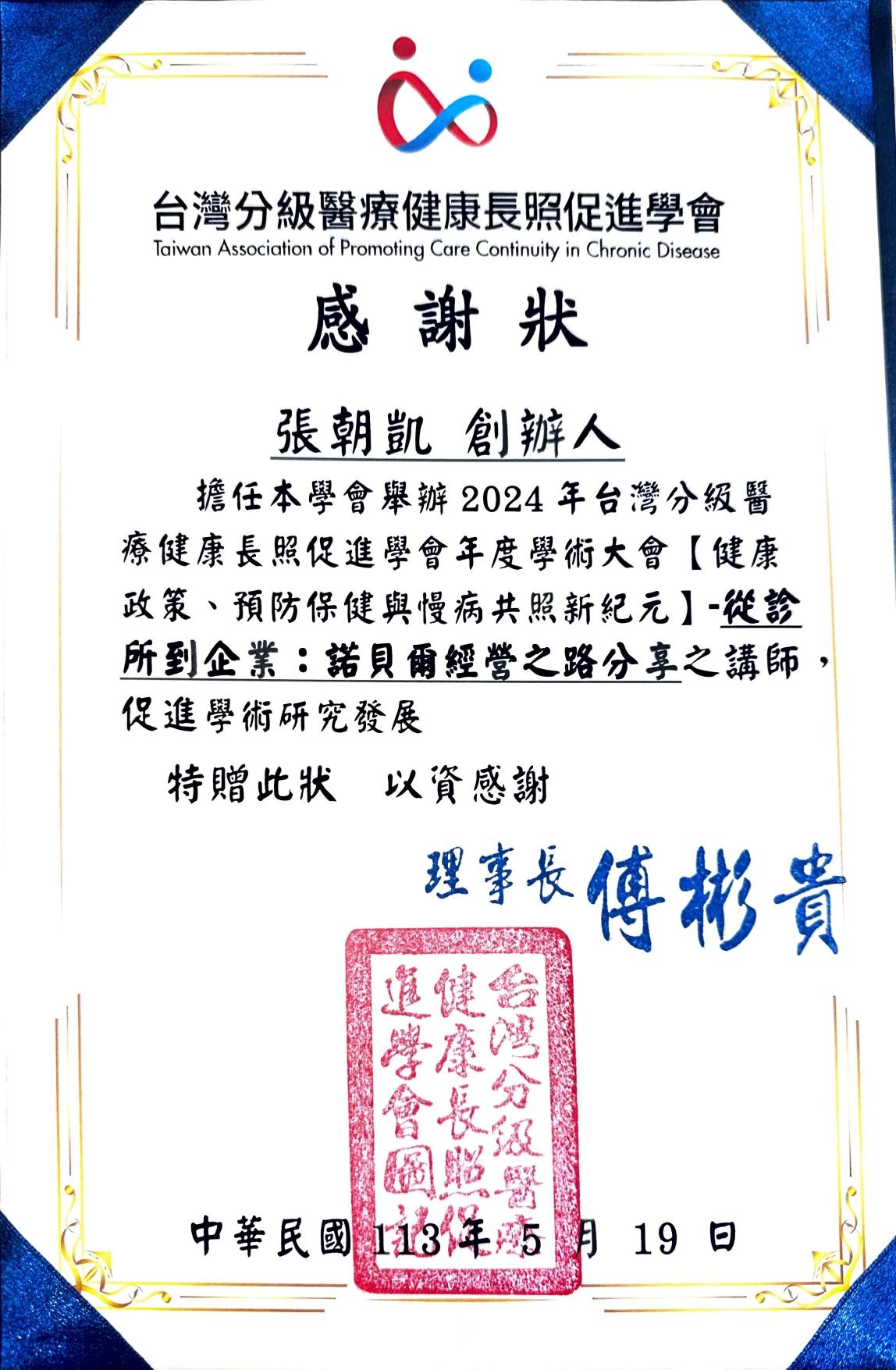 民國113年5月19日-感謝狀-擔任台灣分級醫療健康長照促進學會2024學術大會講師