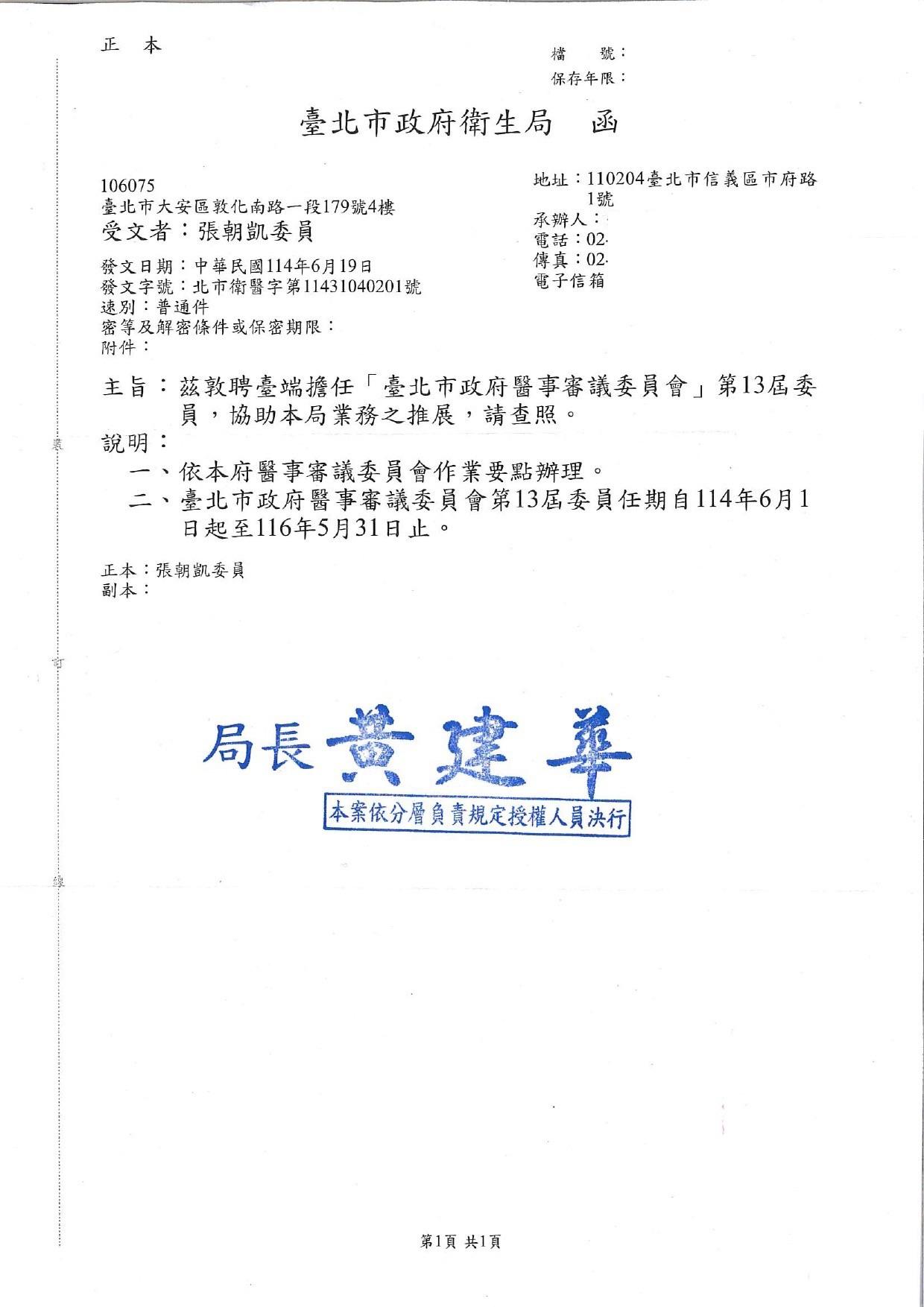 民國114年6月1日至116年5月31日-第13屆台北市政府醫事審議委員會委員