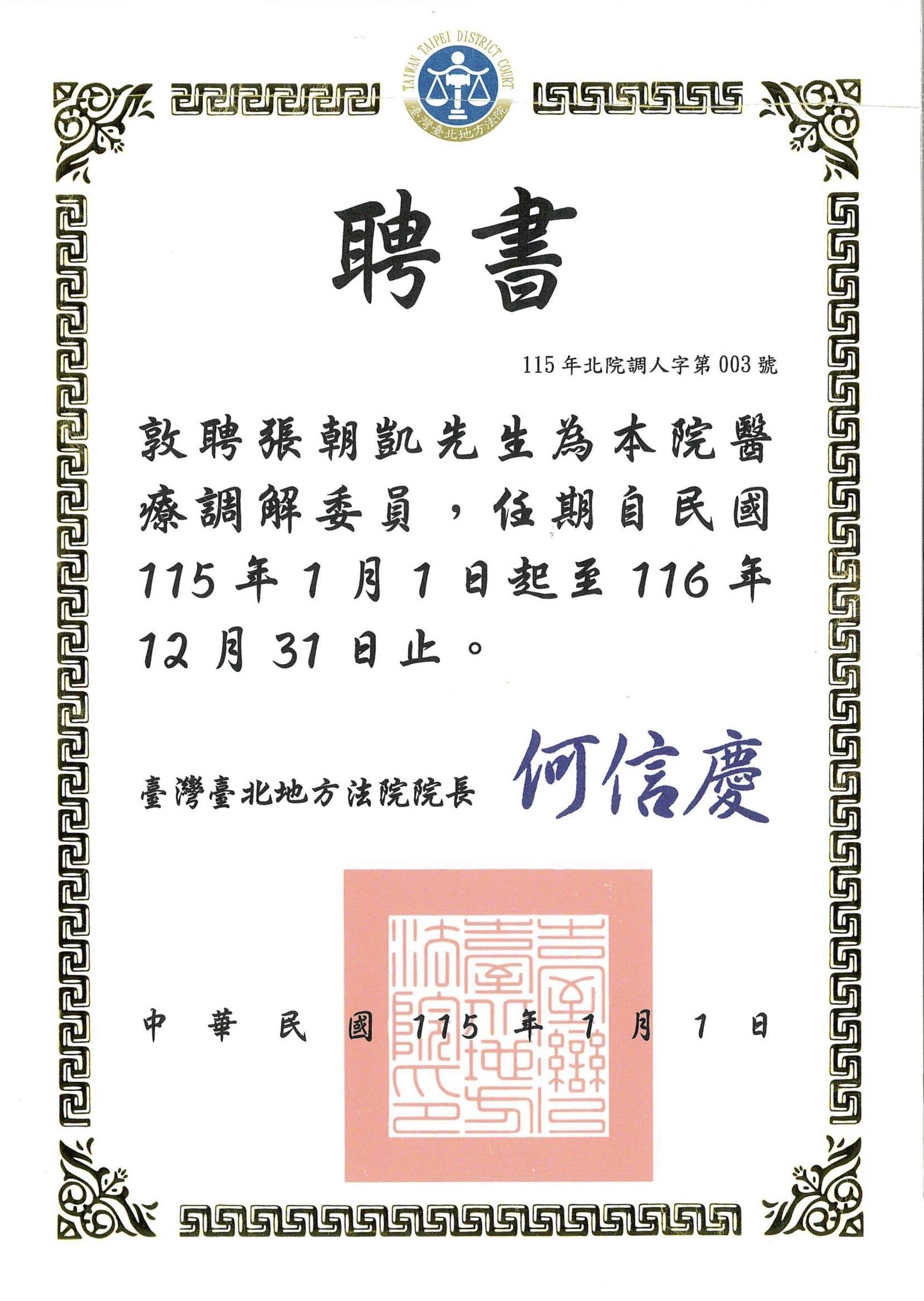 民國115年1月至116年12月-聘書-擔任台北地方法院醫療調解委員