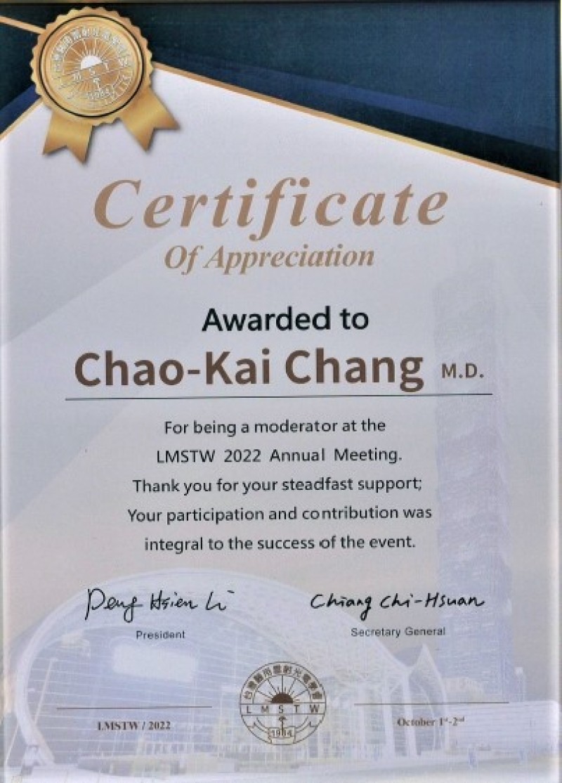 民國111年10月-感謝狀-擔任LMSTW 2022年會暨學術研討會座長-台灣醫用雷射光電學會