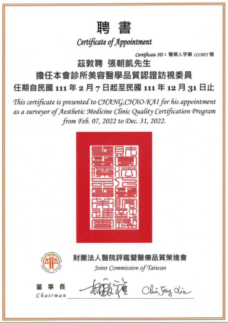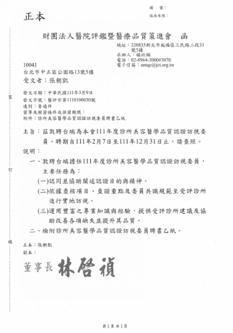 民國111年2月至111年12月-聘書-擔任<財團法人醫院評鑑暨醫療品質策進會>診所美容醫學品質認證 訪視委員