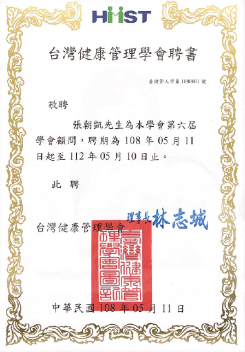 民國108年5月至112年5月-台灣健康管理學會聘書-擔任第六屆學會顧問