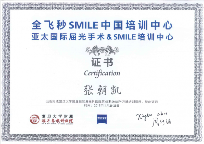 民國108年11月-證書-完成復旦大學附屬眼耳鼻喉科醫院SMILE學習班
