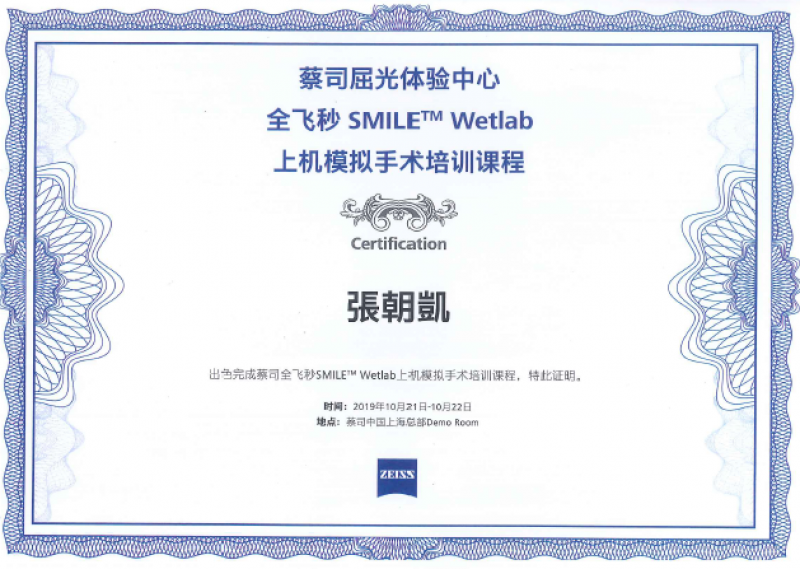 民國108年10月-獎狀-蔡司全飛秒SMILE Wetlab上機模擬手術培訓課程