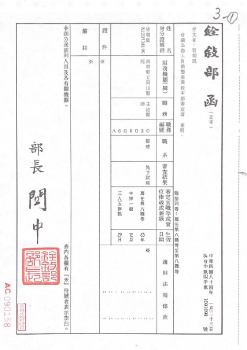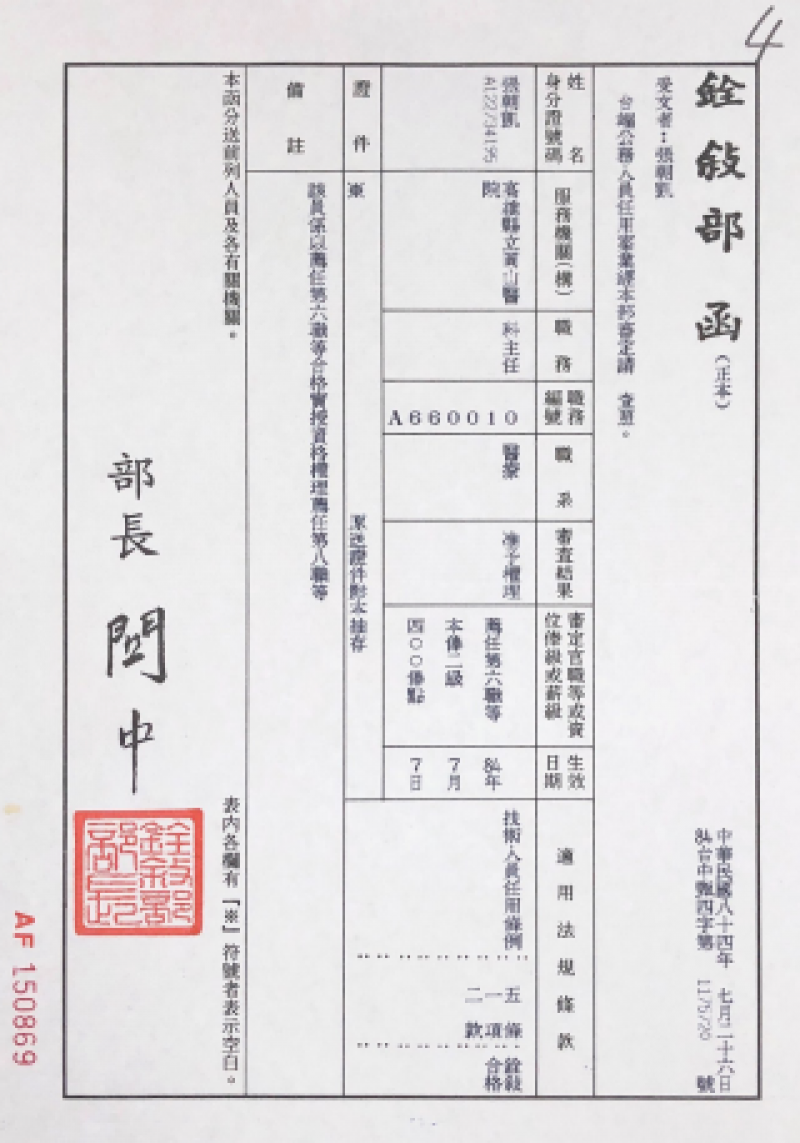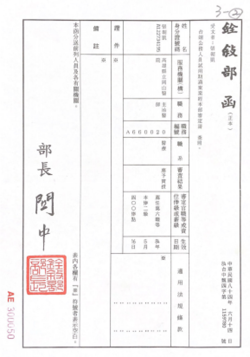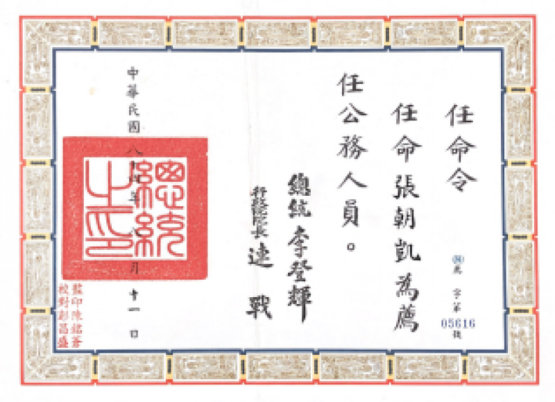 民國84年8月-任命令-任命張朝凱為薦任公務人員