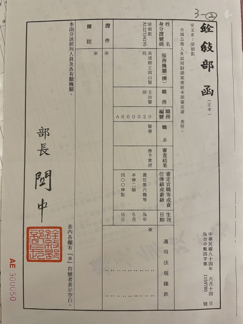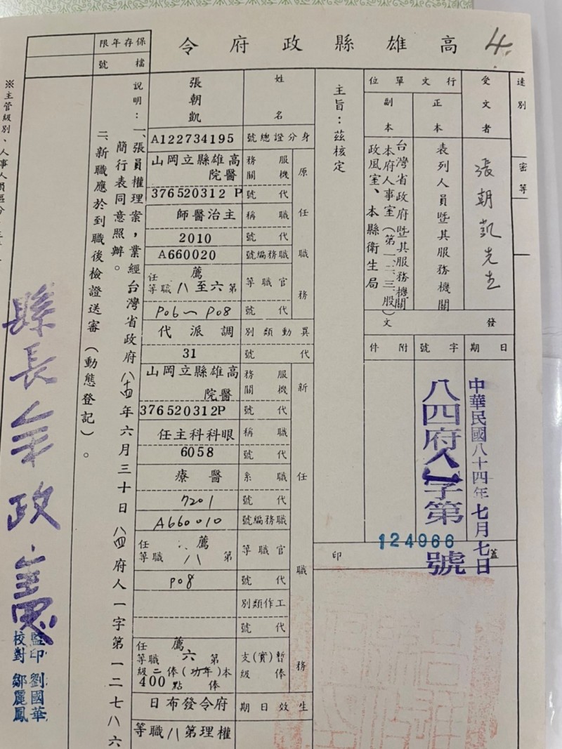 民國84年5月-高雄縣立岡山醫院 眼科主治醫師